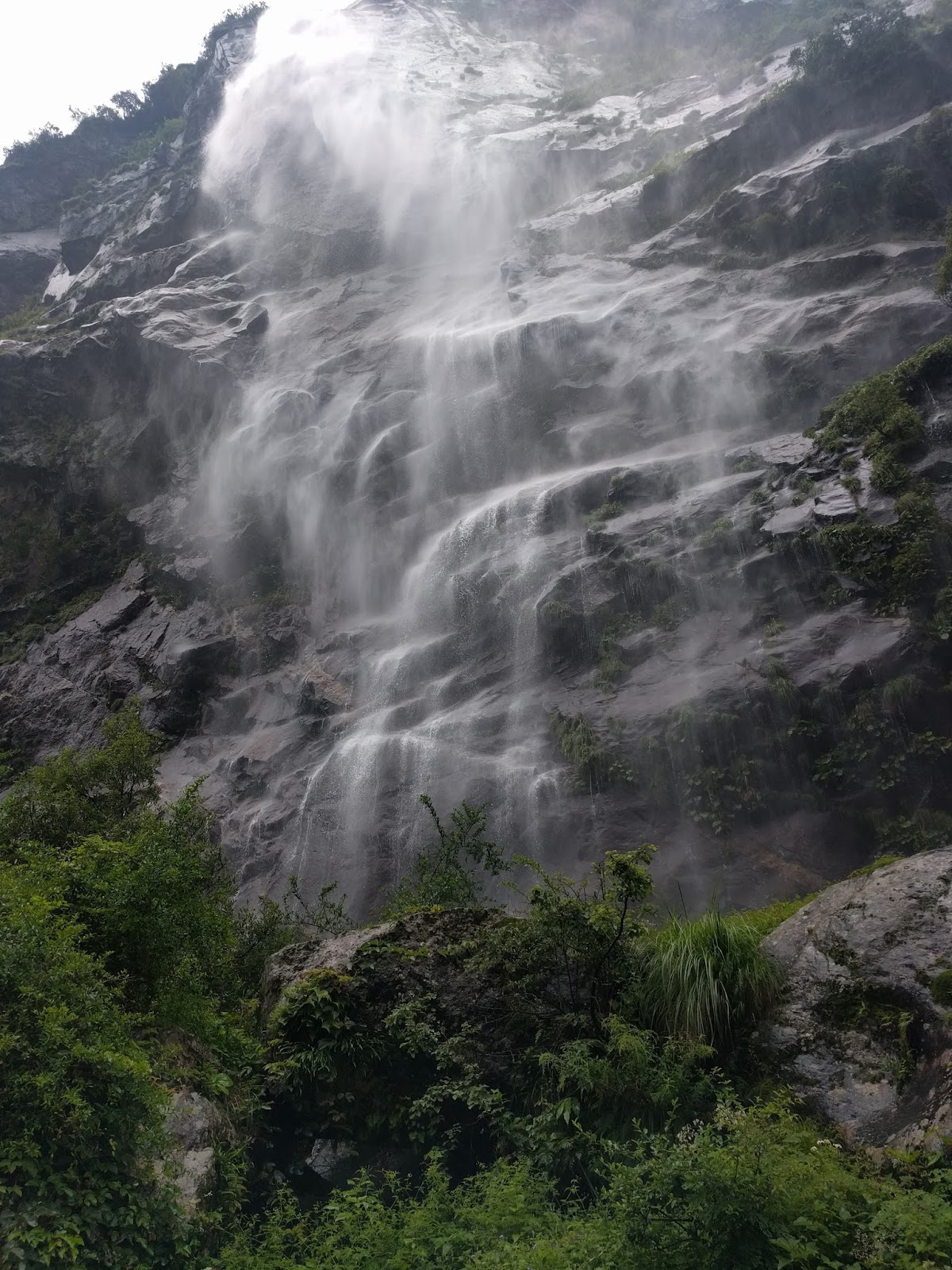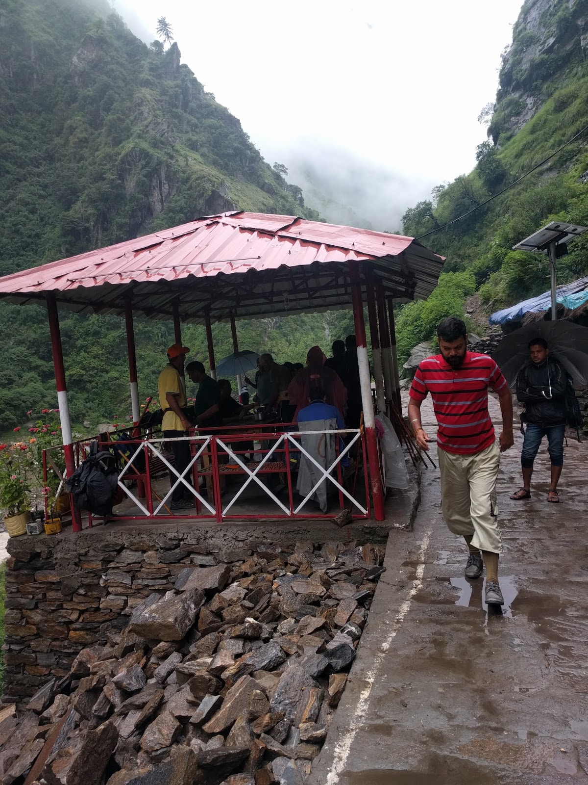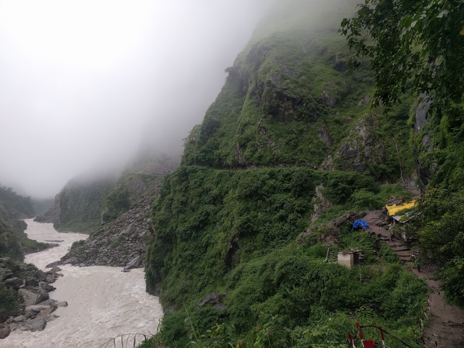 Had lunch at 10 am at Malpa. Rain stopped for a while at Malpa and we all sang bhajans. We kept walking and rain and gorgeous waterfalls along ferocious Kali were our companions. On the other side of river Kali were green mountains of Nepal. There were few landslides on way. Fog,clouds and Sun kept playing peek a boo.